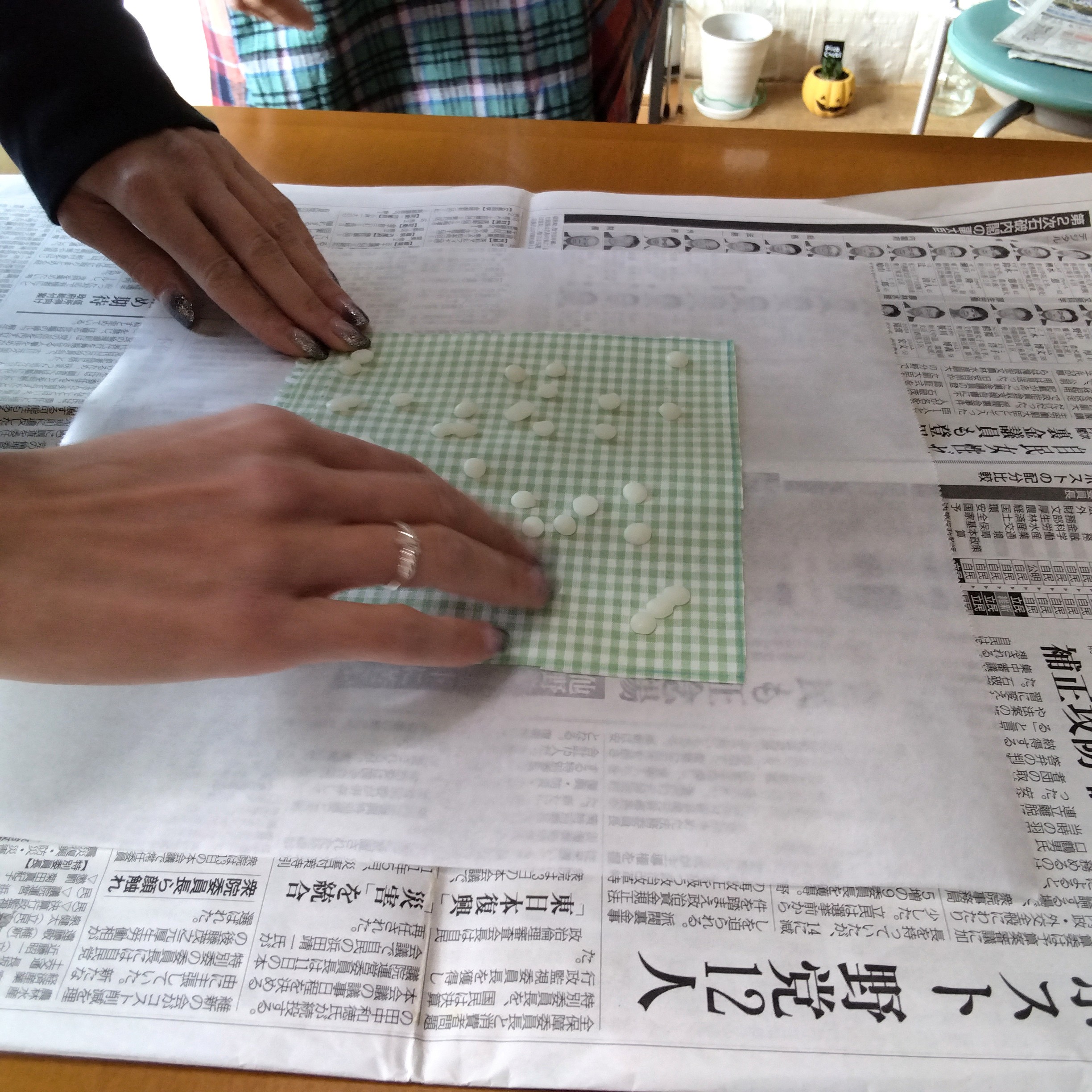新聞紙→クッキングシート→生地→ミツロウをまんべんなく散らします
